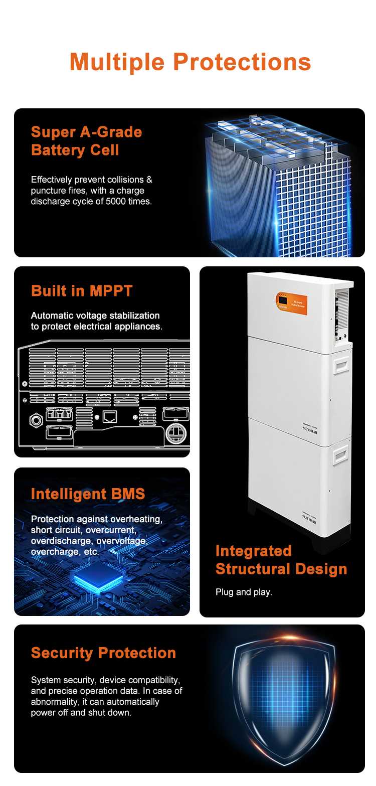 The core advantage of this vertical energy storage system lies in its unprecedented spatial efficiency. Its vertical design saves over 40% of floor space compared to traditional solutions, allowing it to be elegantly integrated into corners of entryways, balconies, or hallways, blending seamlessly with modern home environments. All critical connections are pre-integrated and calibrated at the factory, enabling true plug-and-play functionality. Users only need to complete the basic wiring for the PV panels, grid, and loads, and the system can be commissioned in minimal time, significantly reducing installation complexity and time costs.
