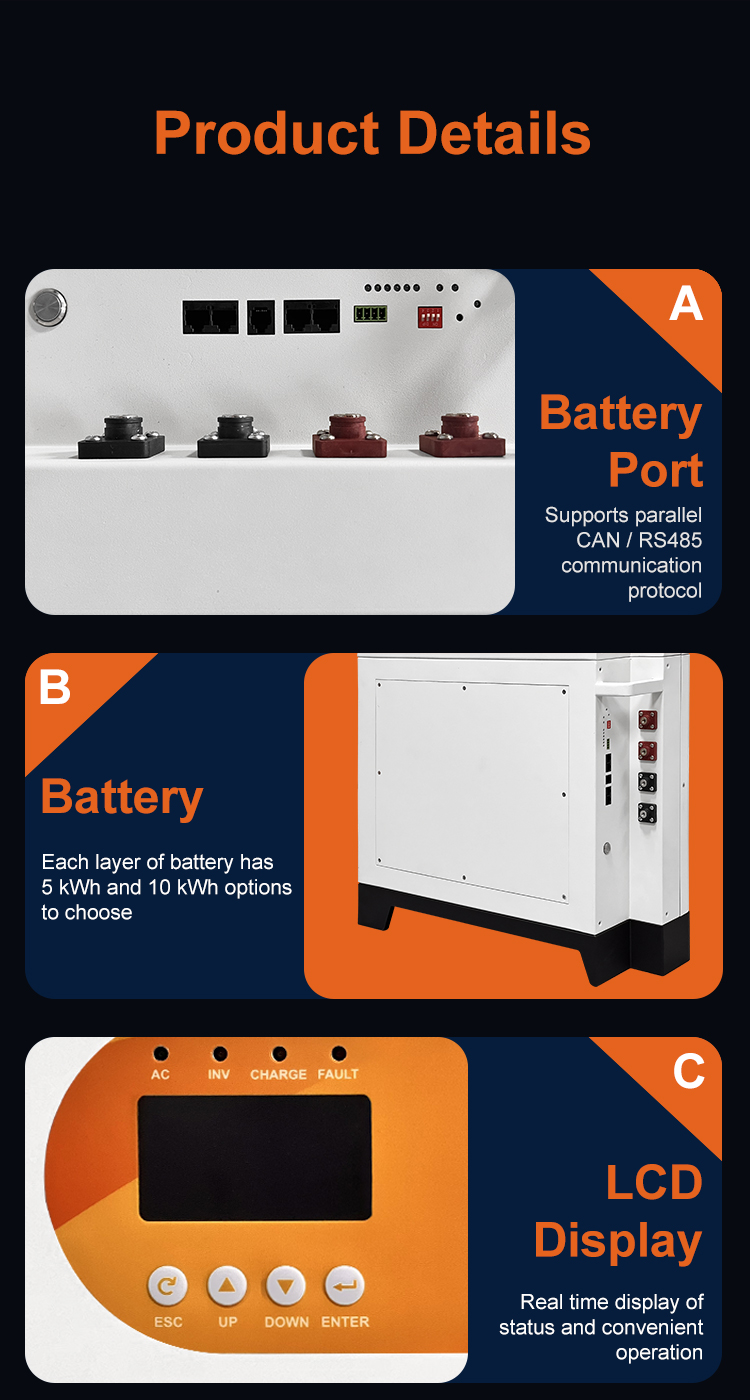 The stable 5kW output power is sufficient to support the operation of daily critical household loads, while the reliable 10kWh storage capacity can effectively store solar energy or off-peak grid electricity for use during nighttime peak hours or to counter temporary power outages, substantially enhancing energy self-sufficiency and power security. Whether for households aiming to maximize solar self-consumption or users seeking a simple and reliable backup power source, this vertical all-in-one unit delivers an efficient and convenient comprehensive smart energy solution with minimal space occupation.