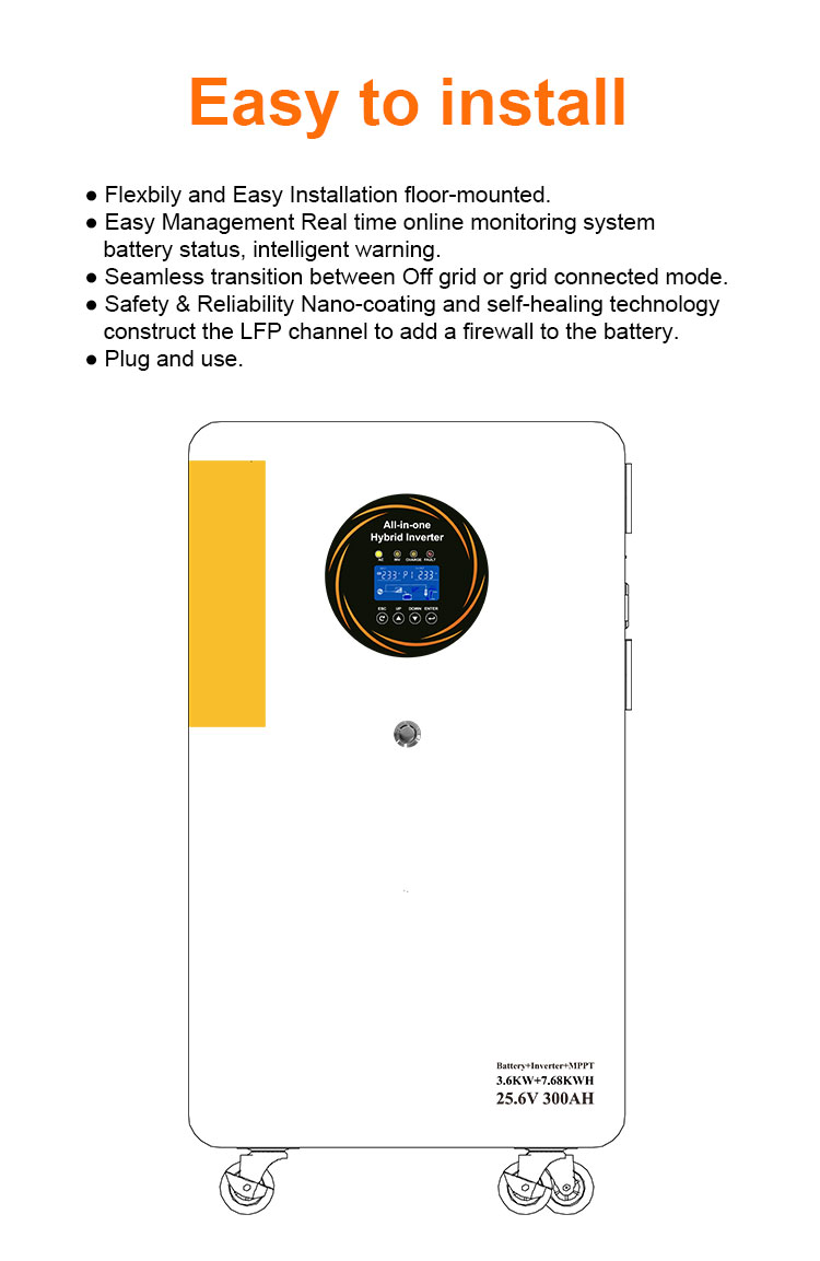 Our 3.6kW+7.68kWh All-in-One Energy Storage System is designed for households and commercial spaces pursuing advanced energy independence. It deeply integrates a powerful 3.6kW bidirectional inverter with a high-capacity 7.68kWh lithium iron phosphate (LiFePO4) battery pack. This is far more than just a piece of equipment—it serves as a self-sufficient energy hub, capable of meeting sustained power demands and enabling deep management of electricity costs.