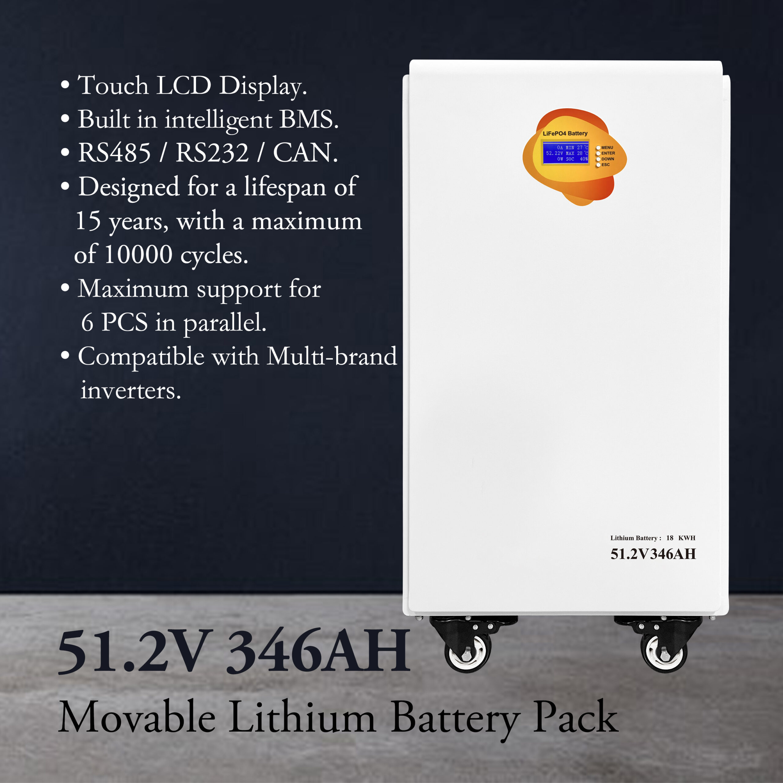 Movable 51.2V 346Ah Deep Cycle LiFePO4 Battery for Solar System Backup